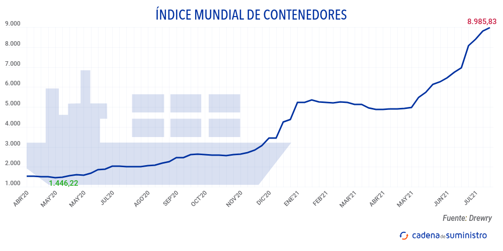 El Índice Mundial de Contenedores elaborado por Drewry, que evalúa las tasas de carga de contenedores en las ocho rutas principales hacia y desde Estados Unidos, Europa y Asia, ha alcanzado en la tercera semana de julio los 8.985,83 dólares/FEU (7.633,24 euros), lo que supone un ascenso del 1% en su duodécimo registro al alza.