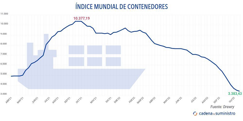El Índice Mundial de Contenedores elaborado por Drewry, que evalúa las tasas de carga de contenedores en las ocho rutas principales hacia y desde Estados Unidos, Europa y Asia, se ha reducido un 3% en la última semana, con 3.383,46 dólares/FEU (3.468,13 euros). El índice suma ya 34 semanas consecutivas a la baja y se sitúa un 66% por debajo del nivel del año anterior por estas fechas y un 67% por debajo del máximo de 10.377 dólares (10.636 euros) alcanzado en septiembre de 2021. También se encuentra un 10% por debajo de la media de los últimos cinco años, situada en 3.740 dólares (3.833 euros). Los precios entre Shanghái y Rotterdam se han reducido en un 3%, llegando a los 4.436 dólares (4.547 euros), igual que en las líneas entre Shanghái y Génova, donde han llegado hasta los 4.614 dólares (4.729 euros). Por su parte, entre Shanghái y Los Ángeles han retrocedido un 5% hasta los 2.497 dólares (2.559 euros), y entre Shanghái y Nueva York han descendido igualmente un 2% hasta los 6.214 (6.369 euros). En cuanto a las conexiones entre Rotterdam y Nueva York, las tasas de carga se han mantenido estables hasta los 7.264 dólares (7.446 euros). Desde la consultora, creen que las tasas continuarán reduciéndose, pero a un ritmo menor a partir de las próximas semanas.