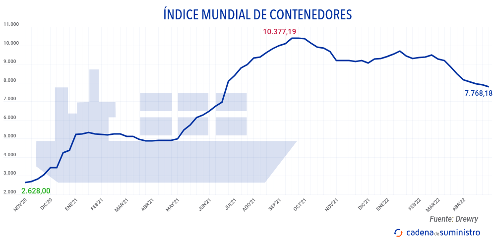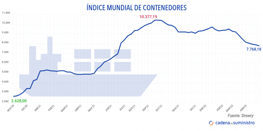 El Índice Mundial de Contenedores elaborado por Drewry, que evalúa las tasas de carga de contenedores en las ocho rutas principales hacia y desde Estados Unidos, Europa y Asia, se ha reducido en un 1,3% en la última semana de abril, con 7.768,18 dólares/FEU (7.347,77 euros).