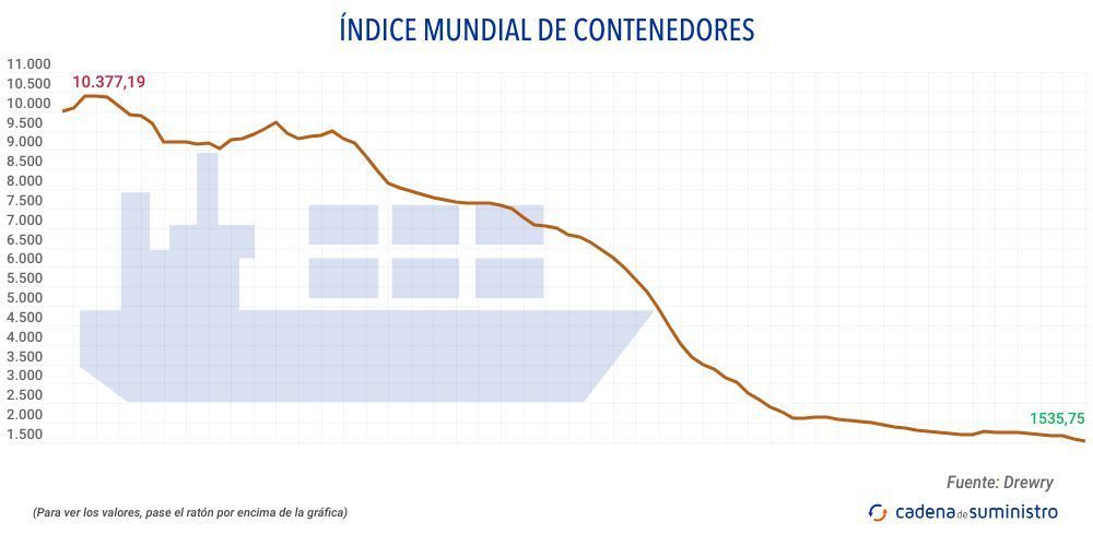El Índice Mundial de Contenedores elaborado por Drewry, que evalúa las tasas de carga de contenedores en las ocho rutas principales hacia y desde Estados Unidos, Europa y Asia, se ha reducido en un 3,5% hasta los 1.535,75 dólares/FEU (1.415,27 euros).