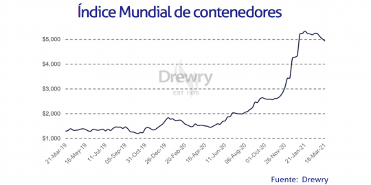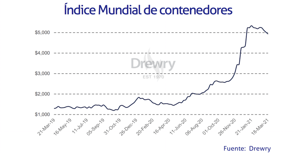 El Índice Mundial de Contenedores elaborado por Drewry, que evalúa las tasas de carga de contenedores en las ocho rutas principales hacia y desde Estados Unidos, Europa y Asia, se ha reducido un 1,7% en la tercera semana de marzo de 2021.