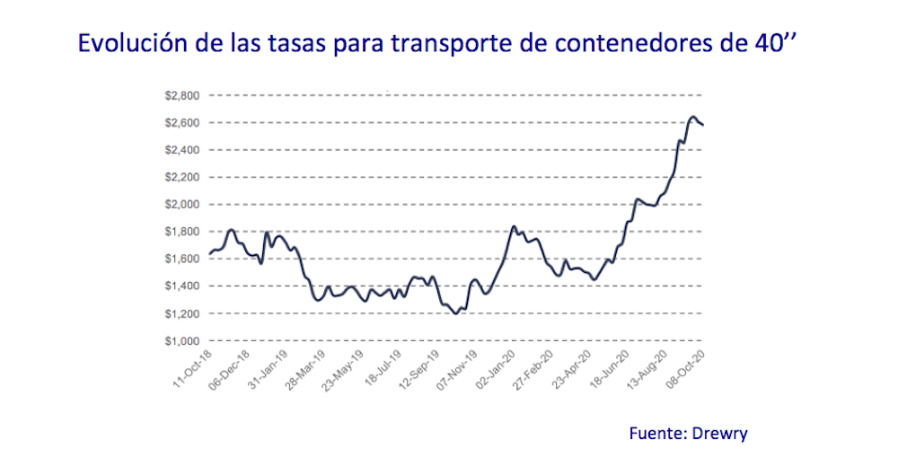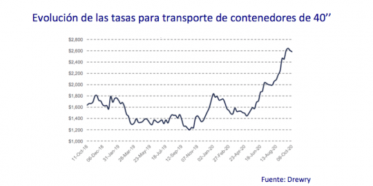 El Índice Mundial de Contenedores elaborado por la consultora Drewry, que evalúa las tasas de carga de contenedores en las ocho rutas principales hacia y desde Estados Unidos, Europa y Asia, se ha reducido un 0,9% en la primera semana de octubre, llegando hasta los 2.583 dólares (2.200 euros).
