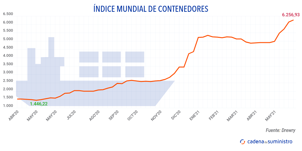 El Índice Mundial de Contenedores elaborado por Drewry, que evalúa las tasas de carga de contenedores en las ocho rutas principales hacia y desde Estados Unidos, Europa y Asia, se ha incrementado en un 2% en la última semana de mayo de 2021.