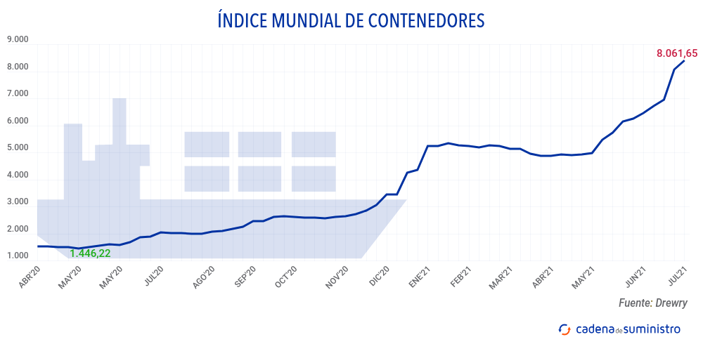 El Índice Mundial de Contenedores elaborado por Drewry, que evalúa las tasas de carga de contenedores en las ocho rutas principales hacia y desde Estados Unidos, Europa y Asia, ha iniciado julio en los 8.399,09 dólares/FEU (7.099,75 euros), lo que supone un ascenso del 4,2%.