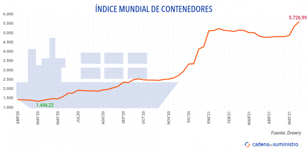 El Índice Mundial de Contenedores elaborado por Drewry, que evalúa las tasas de carga de contenedores en las ocho rutas principales hacia y desde Estados Unidos, Europa y Asia, continúa en su tendencia alcista que parece no tener fin, incrementándose un 4,7% en la segunda semana de mayo de 2021.