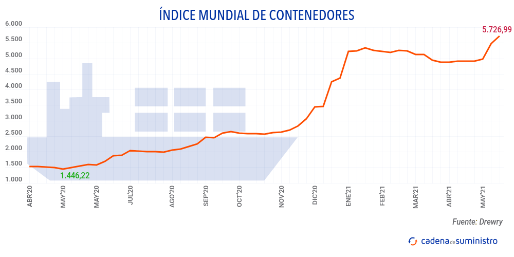 El Índice Mundial de Contenedores elaborado por Drewry, que evalúa las tasas de carga de contenedores en las ocho rutas principales hacia y desde Estados Unidos, Europa y Asia, continúa en su tendencia alcista que parece no tener fin, incrementándose un 4,7% en la segunda semana de mayo de 2021.