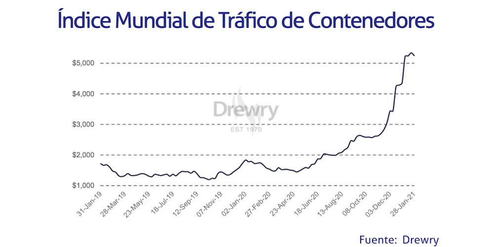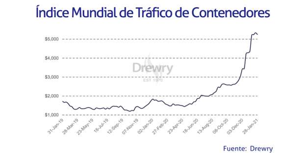 El Índice Mundial de Contenedores elaborado por Drewry, que evalúa las tasas de carga de contenedores en las ocho rutas principales hacia y desde Estados Unidos, Europa y Asia, se ha reducido un 1,7% en la última semana de enero de 2021.
