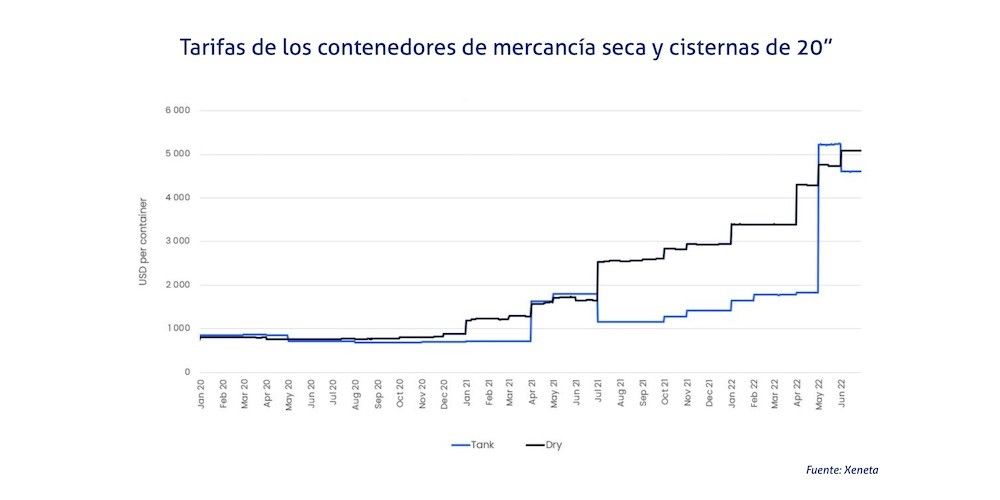 En su punto más alto, la diferencia entre las tarifas de contenedores de carga seca y los contenedores cisterna alcanzó los 2.500 dólares a mediados de abril, y ha sido en mayo cuando el mercado ha comenzado a normalizarse, llegando a situarse por un breve espacio de tiempo las tasas de los contenedores cisterna por encima de las de los de mercancía seca.