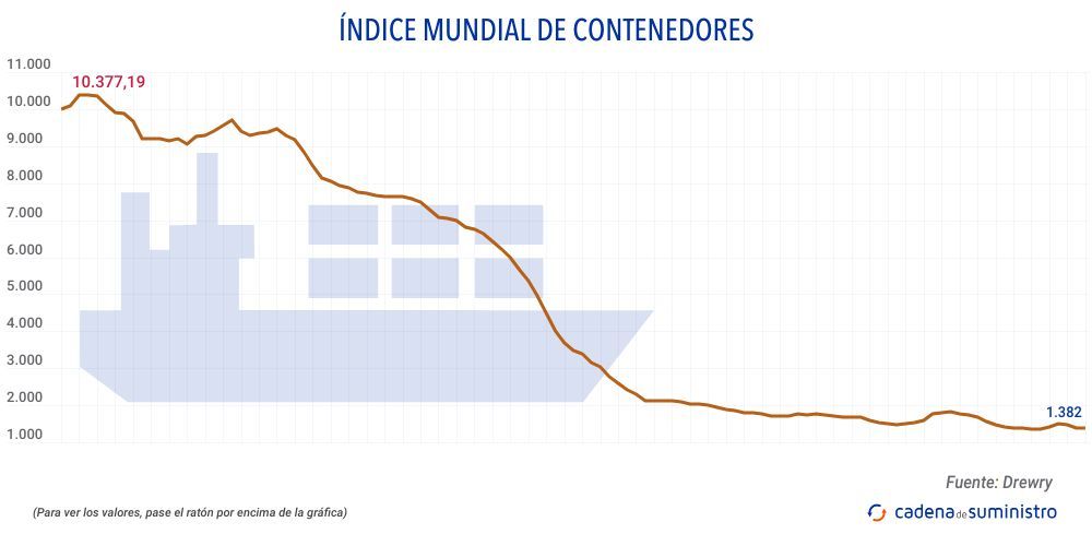 El Índice Mundial de Contenedores elaborado por Drewry, que evalúa las tasas de carga de contenedores en las ocho rutas principales hacia y desde Estados Unidos, Europa y Asia, se ha mantenido estable en los 1.382 dólares/FEU (1.267 euros).