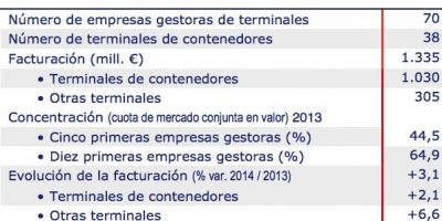 Por su parte, la facturación del resto de terminales portuarias, ya sea de mercancía general, graneles o carga rodada, se cifró en 305 millones de euros, el 22,8% del total, registrando un crecimiento del 6,6% respecto a 2013.