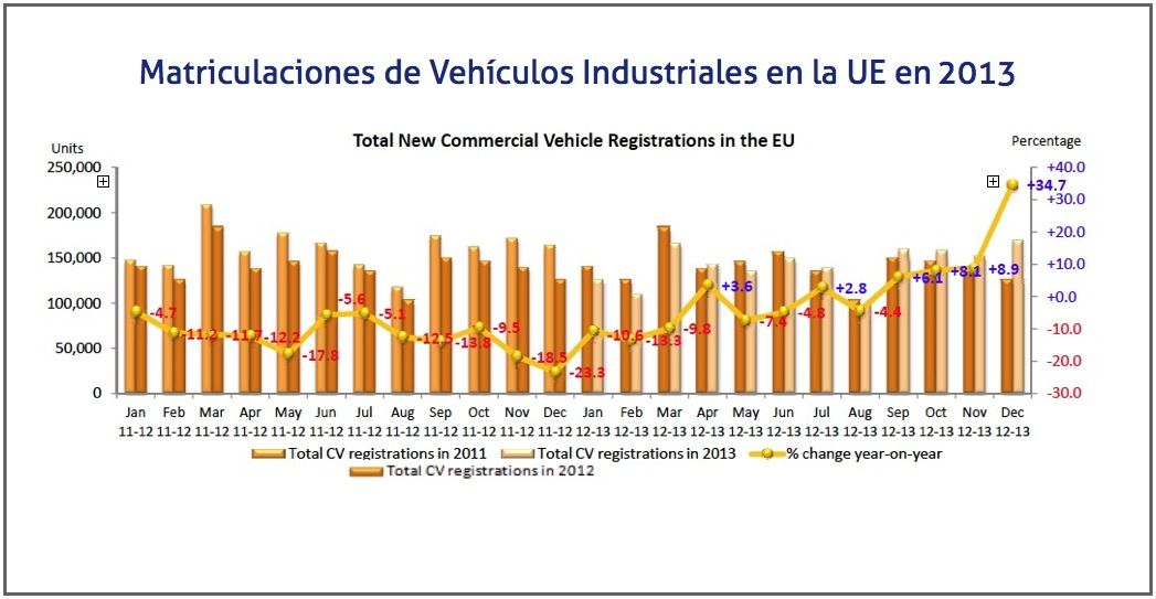 Las matriculaciones de vehículos industriales en la Unión Europea, han cerrado el año con un incremento del 1% y un total de 1.711.843 unidades. España ha impulsado este incremento junto a Reino Unido, ya que han sido los únicos mercados dentro de los más importantes, en finalizar el ejercicio 2013 con tasas positivas.