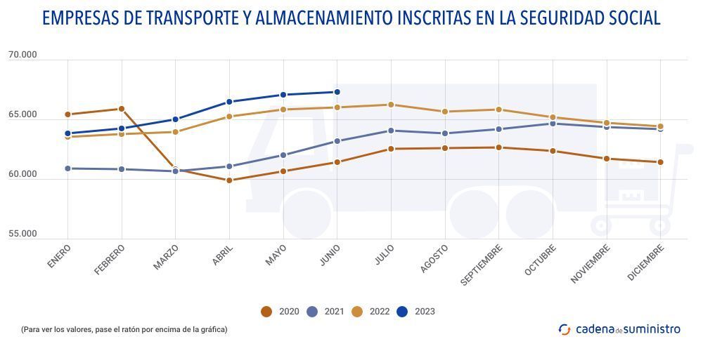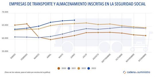 Las 67.321 empresas de transporte y almacenamiento inscritas en la Seguridad Social en junio suponen el 5,063% del total de 1.331.470 que había en total el país en el mes, así como el 6,7% de las 999.605 del sector servicios existentes en el período.