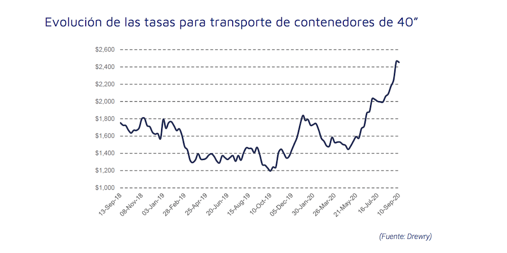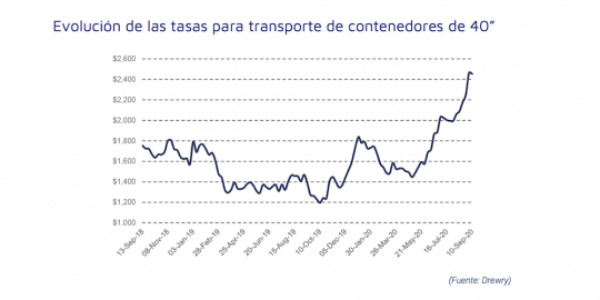 El Índice Mundial de Contenedores elaborado por la consultora Drewry, que evalúa las tasas de carga de contenedores en las ocho rutas principales hacia y desde Estados Unidos, Europa y Asia, ha caído un 0,5% en la segunda semana de septiembre, llegando hasta los 2.453 dólares (2.060 euros).