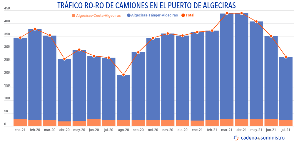 El número de camiones que cruza el Estrecho de Gibraltar en las líneas que conectan el puerto de Algeciras con el norte de África ha llegado a 26.916 en el mes de julio, lo que supone un ligero incremento del 0,99% respecto a los 26.652 del mismo periodo de 2020, en plena crisis sanitaria del Covid-19.