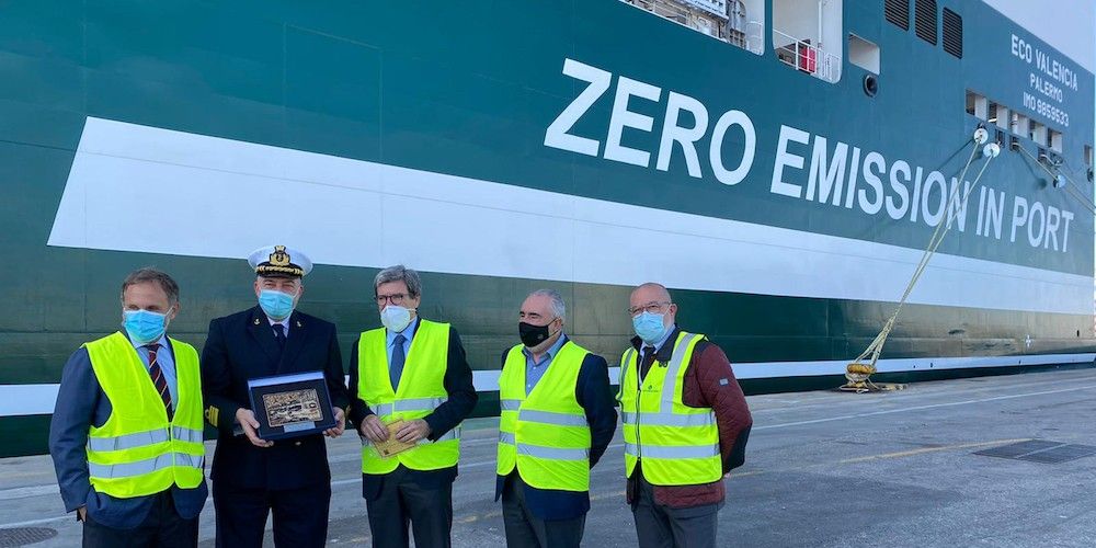 El presidente de la Autoridad Portuaria de Valencia, Aurelio Martínez, y el consejero delegado del Grupo Grimaldi en España, Mario Massarotti, han recibido al Eco Valencia, el primer buque híbrido de la naviera que garantiza cero emisiones en puerto.