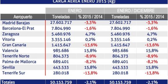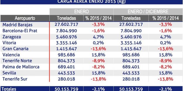 Durante el mes de enero, los aeropuertos españoles de la red de Aena han transportado 50.153.759 kg de carga aérea, un 2,1% menos que en el mismo mes de 2014.
