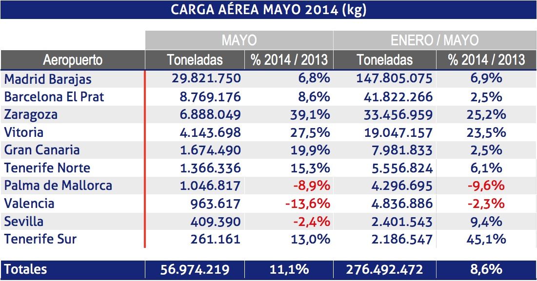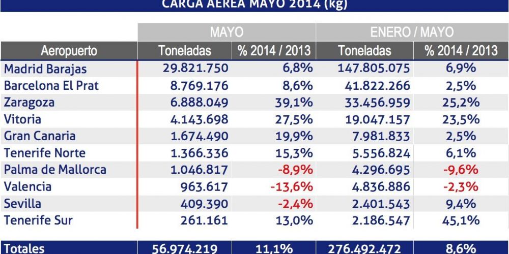 Durante el mes de mayo, los aeropuertos españoles de la red de Aena han transportado 56.974.219 kg de carga aérea, un 11,1% más que en el mismo mes de 2013, un crecimiento que se ha visto impulsado, sobre todo, por el aumento de la carga en los aeropuertos de Foronda y de Zaragoza. En cuanto a los datos acumulados, el tráfico de carga ha ascendido a 276.492.472 kg, que suponen un 8,6% más que en el mismo período de 2013.