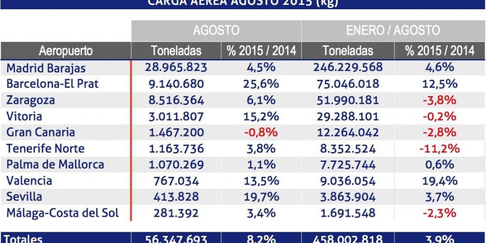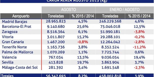 Durante el mes de agosto, los aeropuertos españoles de la red de Aena han transportado 56.347.693 kg de carga aérea, un 8,2% más que en el mismo mes de 2014. En cuanto a los datos acumulados, el tráfico de carga ha ascendido a 458.002.818 kg, que suponen un 3,9% más que en el mismo período de 2014.