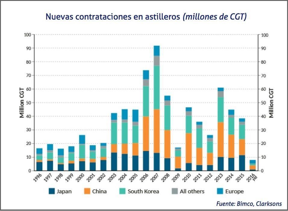 Durante 2016, la carga de trabajo de los astilleros, es decir, el plazo medio en el que entregan los buques que tienen en cartera, se ha reducido en China, Japón y Corea del Sur, en aproximadamente seis meses con respecto al inicio del ejercicio. Ahora, los astilleros surcoreanos terminan sus encargos en menos de dos años, los chinos en menos de tres y los japoneses en aproximadamente tres años y cuatro meses.