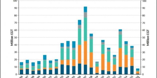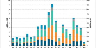 Por contra, los astilleros europeos experimentan un fuerte crecimiento desde 2014, cuando la carga de trabajo se establecía en menos de tres años, hasta situarse en los 5,4 años en la actualidad, en línea con el crecimiento de la CGT contratada. Esto demuestra, según los expertos de Bimco, que las nuevas ordenes de contratación adicionales "no están siendo absorbidas por los nuevos astilleros que entran en el mercado".