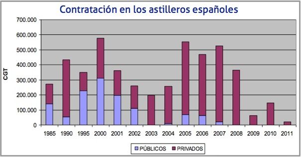 Los nuevos contratos del año 2009 se produjeron en astilleros privados, mientras los astilleros públicos no consiguieron aumentar su cartera de pedidos. El año 2010 siguió la misma línea que el anterior, al igual que ha ocurrido en 2011, en el que sólo se han obtenido contratos para los astilleros privados, siguiendo los públicos sin tener cartera de pedidos.
