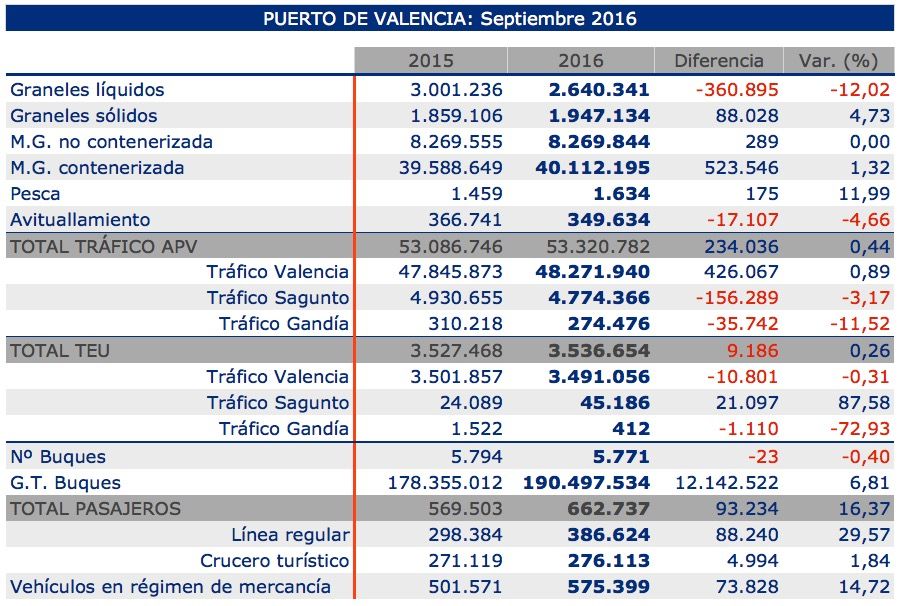 Los puertos de Valencia, Sagunto y Gandía, gestionados por la Autoridad Portuaria de Valencia, han manipulado un total de 53.320.782 tn entre enero y septiembre de 2016, lo que supone un 0,44% más que en el mismo periodo del año anterior.