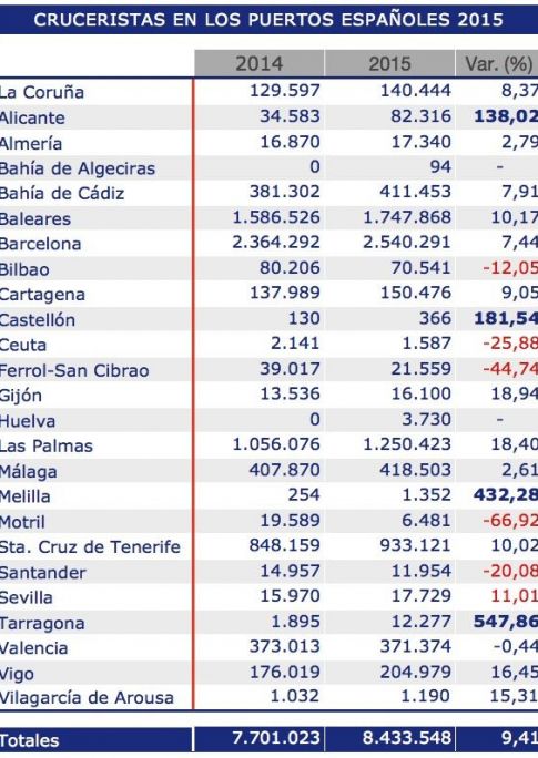 El tráfico de pasajeros de cruceros en 2015 ha ascendido a 8.435.966 cruceristas, con un incremento del 9,4% respecto al año anterior.