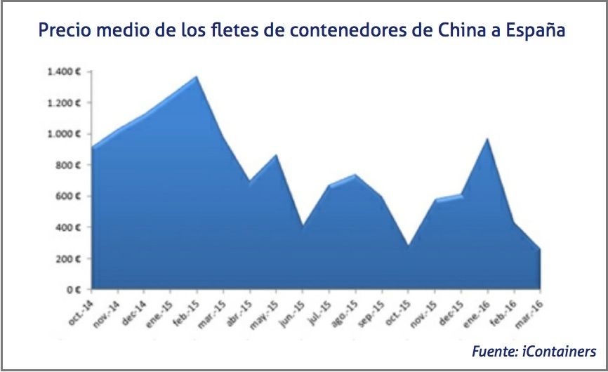 El precio de enviar un contenedor desde los puertos de Barcelona y Valencia a los puertos chinos de Ningbo, Quingdao, Shanghai, Shenzen y Tianjin se sitúa, de media, en 90 euros/TEU. No obstante, desde iContainers señalan que el flete ha llegado a situarse en febrero a 45 dólares/TEU en los servicios entre los puertos españoles y Shenzhen.