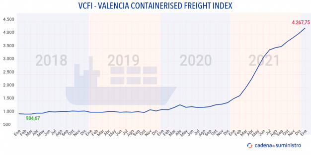 El Valencia Containerised Freight Index, VCFI, inicia 2022 con una nueva subida de un 4,9% con relación a diciembre del año pasado, hasta alcanzar un valor de 4.267,75 puntos, debido al crecimiento de la demanda del transporte marítimo, el precio del combustible y la congestión en puertos de los Estados Unidos y China.