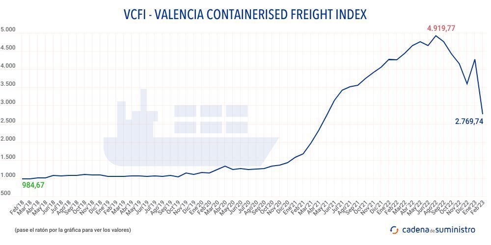 El Valencia Containerised Freight Index, VCFI, mantiene su tendencia bajista y acumula seis meses seguidos a la baja.