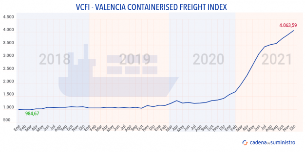 El Valencia Containerised Freight Index, VCFI, mantiene su tónica al alza en diciembre, con un crecimiento del 4,14% que le ha llevado a los 4.063,59 puntos, si bien cabe apuntar que desde agosto, los incrementos están siendo más moderados que en los meses anteriores.