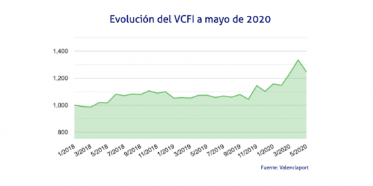 Como muestra de los efectos de la crisis sanitaria en la economía planetaria, el Valencia Containerised Freight Index presenta una caída más moderada en mayo, con un retroceso de un 6,64% que deja el índice en los 1.245,86 puntos, casi 200 puntos por encima de los datos de mayo de 2019.
