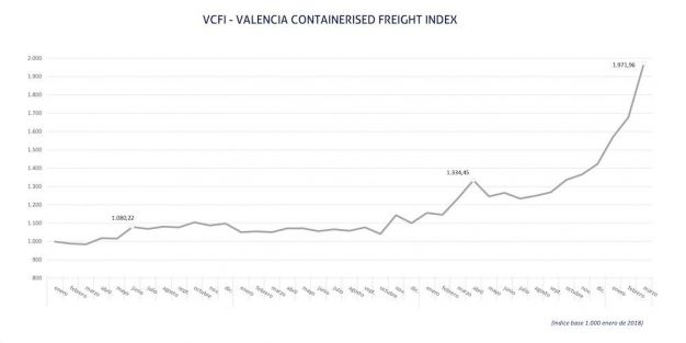 El Valencia Containerised Freight Index ha aumentado un 17,48% en marzo con respecto al mes anterior y se sitúa en los 1.971,16 puntos, la cifra más alta desde el inicio de la serie histórica en enero de 2018.