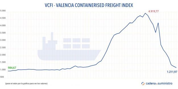 El Valencia Containerised Freight Index, VCFI, mantiene un mes su tendencia a la baja y acumula un ejercicio completo a la baja, para colocarse en niveles del primer cuarto de 2020.