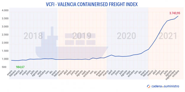 El Valencia Containerised Freight Index (VCFI) rompe la tendencia de crecimiento de los dos últimos meses y ha incrementado su ritmo de ascenso en octubre.