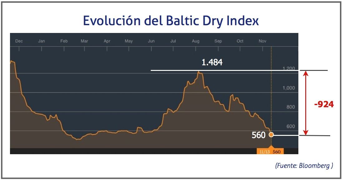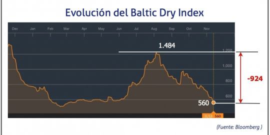 Después de que en los meses de junio y julio acusaran una mejoría breve y fuera de toda previsión, ya que en los meses de verano suelen ser negativos para estos tráficos, que llevó momentáneamente al BDI hasta 1.200 puntos, desde comienzos de agosto han iniciado más que un declive un auténtico derrumbe, hasta situarse en los 560 puntos.