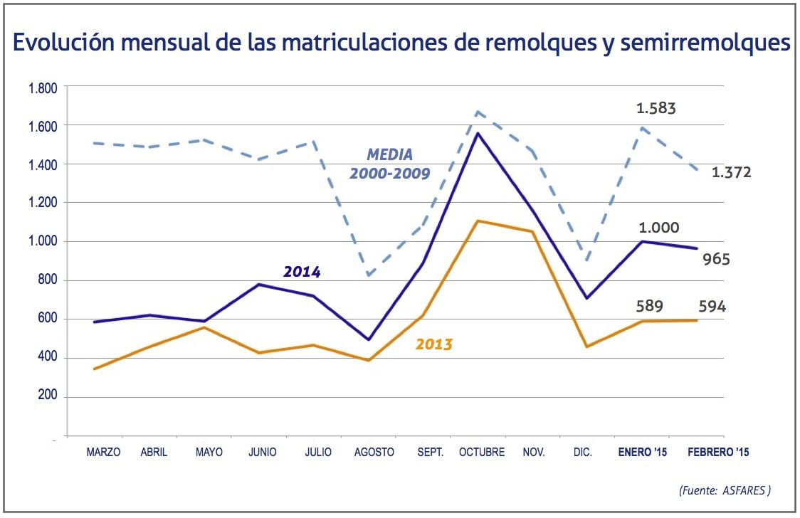 Las matriculaciones de remolques y semirremolques de más de 12 tn, en el segundo mes del año, se han situado en las 965 unidades, según los datos facilitados por la asociación de fabricantes ASFARES, lo que supone un 62% más que en febrero del año anterior.