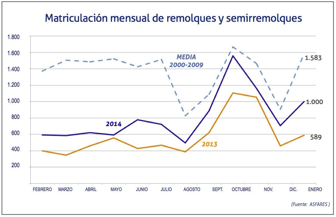 Las matriculaciones de remolques y semirremolques de más de 12 tn, en el primer mes del año, ha sido un total de 1.000 unidades, según los datos facilitados por la asociación de fabricantes ASFARES, lo que supone un 70% más que en enero del año anterior.