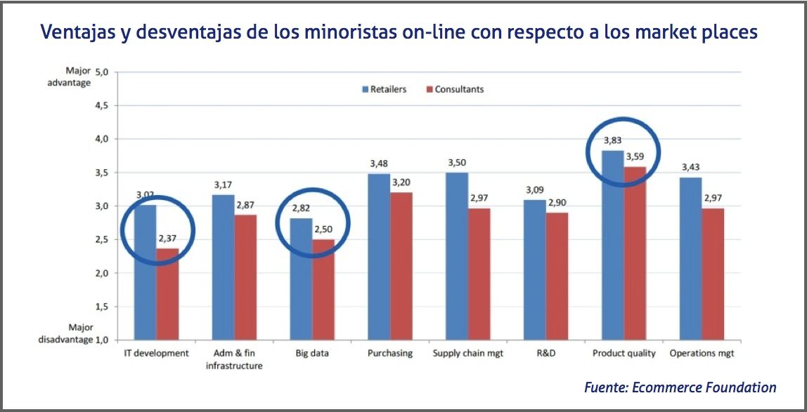Además, un dato revelador del estudio es la comparación entre la opinión de los retailers y los consultores especializados encuestados, ya que indica que los comerciantes tal vez sobreestiman su capacidad para enfrentarse a las grandes plataformas, ya que solo consideran estar en desventaja con respecto a las mismas en lo que respecta al Big Data y el desarrollo de las IT.