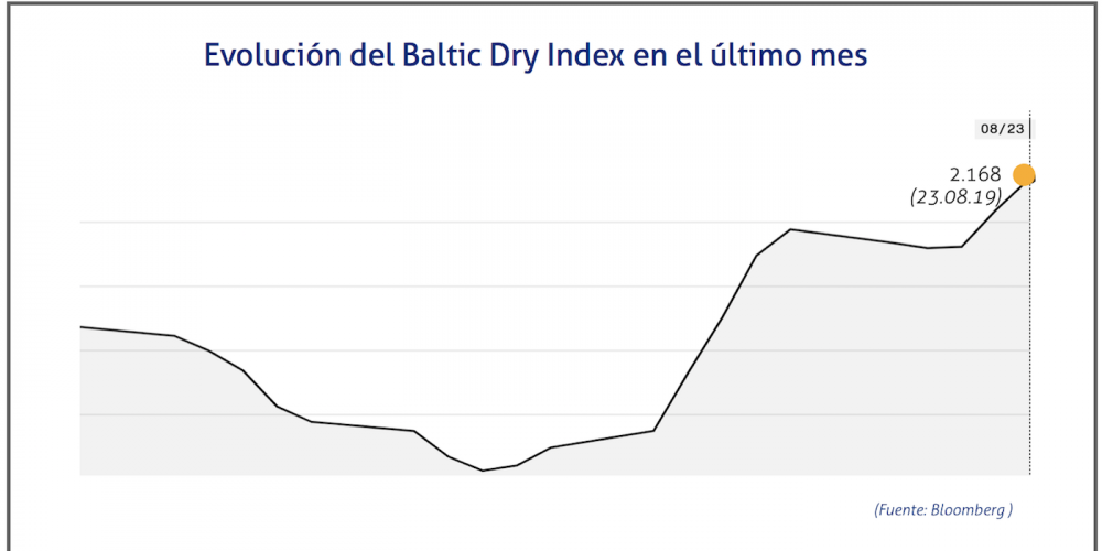 El Baltic Dry Index, BDI, que refleja los precios de los fletes de los buques graneleros tomando como referencia un total de 23 rutas marítimas, se ha situado el viernes 23 de agosto de 2019 en los 2.168 puntos, lo que supone un ascenso de 50 puntos o del 2,36%.