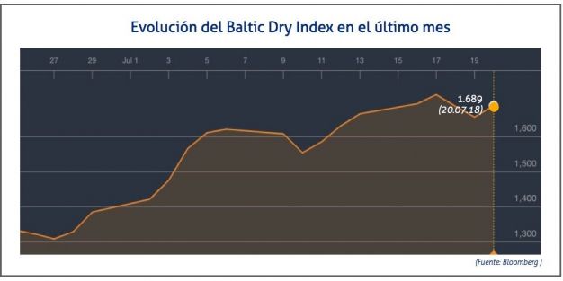 El Baltic Dry Index, BDI, que refleja los precios de los fletes de los buques graneleros tomando como referencia un total de 23 rutas marítimas, ha aumentado el viernes 20 de julio de 2018 hasta los 1.689 puntos, lo que supone un incremento de 32 puntos o del 1,93%.