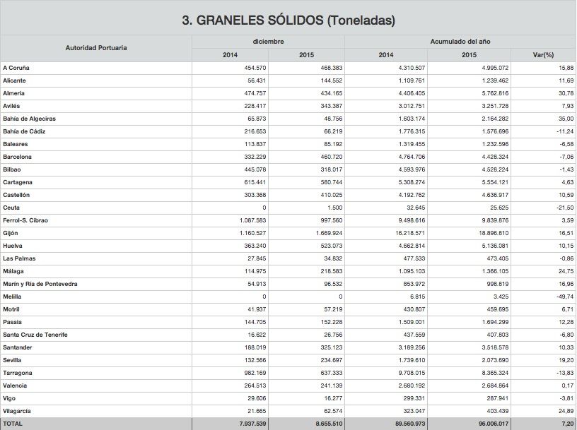El tráfico de graneles sólidos en los puertos españoles ha crecido un 7,2% en 2015 con respecto al ejercicio anterior, hasta totalizar las 96.006.017 tn.