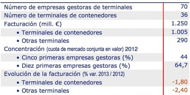 En 2013 han operado en el sector en torno a 70 empresas gestoras de terminales portuarias, dedicadas en su mayoría exclusivamente a la gestión y explotación de una única terminal de contenedores, graneles, mercancía general o carga rodada.