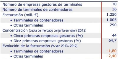 Las terminales de contenedores reunieron el 78% de los ingresos, con 1.005 millones de euros y una caída respecto a 2012 del 1,8%. Por su parte, la facturación del resto de terminales portuarias, que son mercancía general, graneles y carga rodada, se cifró en 290 millones de euros, el 22% del total.