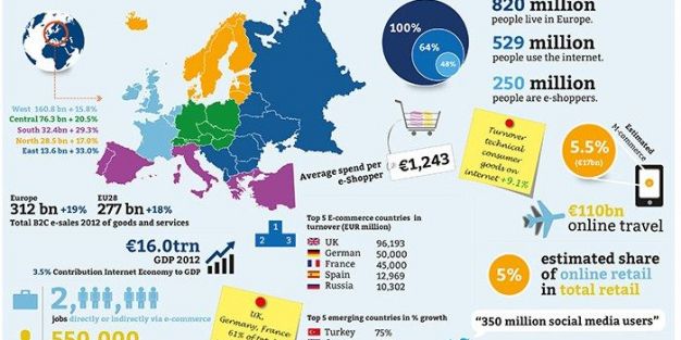 El Producto Interno Bruto (PIB) de Europa en 2012 se estima que ha llegado a 16.000 millones de euros, de los cuales el PIB de la EU28 fue de poco más del 80%. Ecommerce Europa estima que la proporción de la economía de Internet en Europa es del 3,5%, un porcentaje que se duplicará para el año 2016 y se triplicará para el año 2020, dado el hecho de que la economía de Internet crece mucho más rápido que la economía en general.