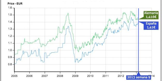 En relación a la media de la eurozona, los 1,658 euros que hay que abonar por el litro de gasolina supera en un 9,9% a la tarifa española, en tanto que el diesel, con 1,475 euros, es un 4,3% superior.