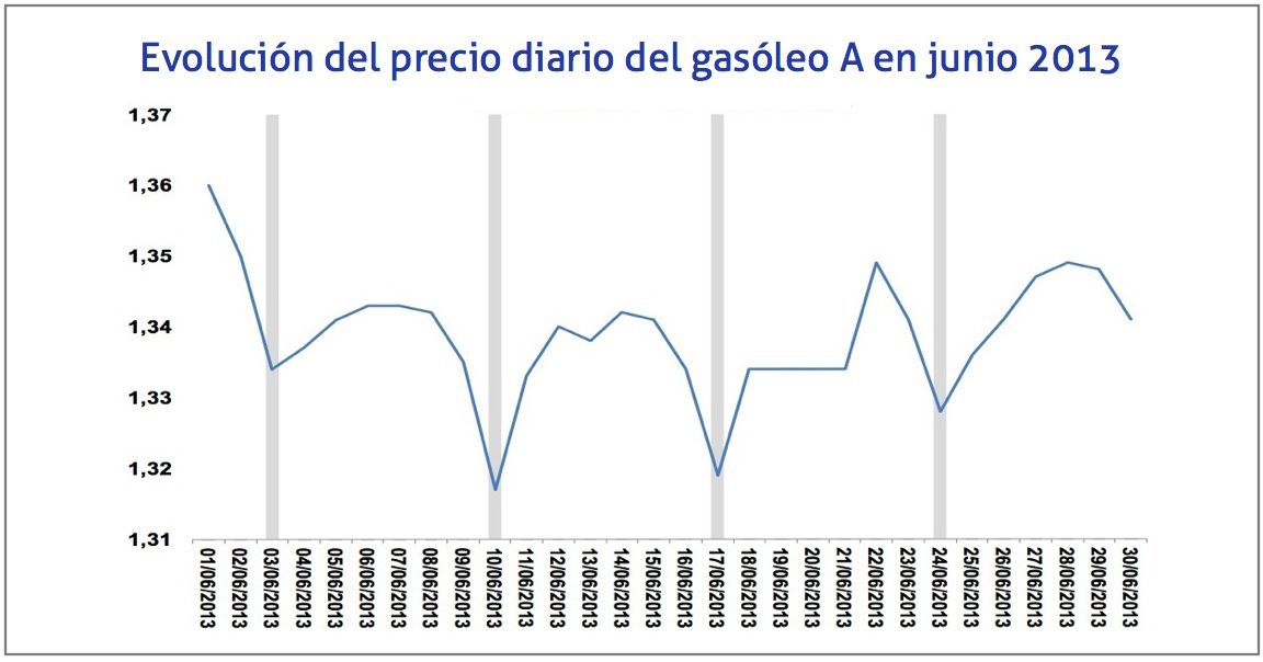 Las caídas de precios los viernes vienen acompañadas de fuertes subidas los jueves y, en menor medida, los sábados. Por lo que del 1 al 14 de julio, los precios del gasóleo A retomaron la senda ascendente, con una subida del 1,4%.