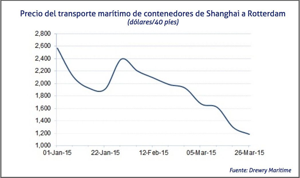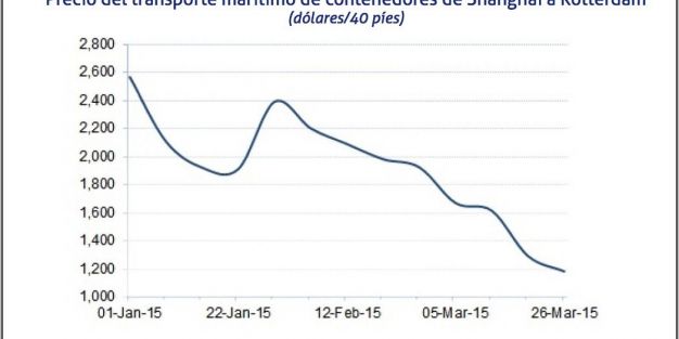 El precio de enviar un contenedor de 40 píes por vía marítima desde el puerto de Shanghai al puerto de Rotterdam se ha reducido a más de la mitad durante los tres primeros meses de 2015, pasando de los 2.600 dólares (2.400 euros) establecidos a principios de año, hasta los 1.180 dólares (1.090 euros) que el Índice Mundial de Contenedores registra a viernes 27 de marzo.