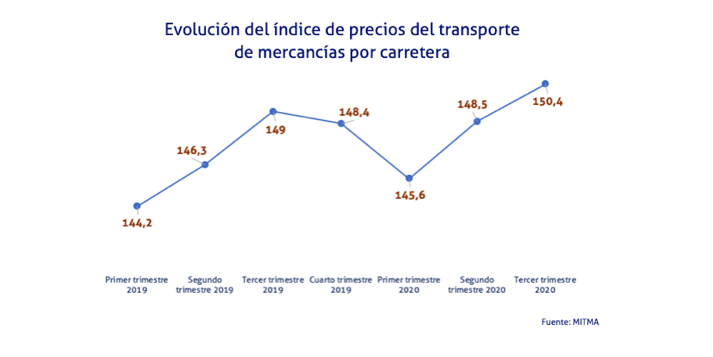 En este sentido, entre julio y septiembre de 2020, los precios de los servicios de transporte de mercancías por carretera han registrado un incremento de un 0,94% anual, hasta colocarse a finales de septiembre en un índice de 150,4 puntos, según los últimos datos publicados por el Ministerio de Transportes, Movilidad y Agenda Urbana.