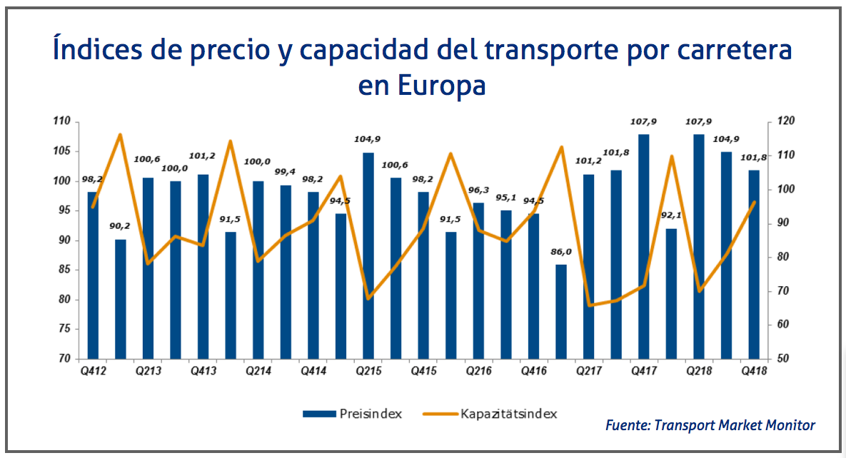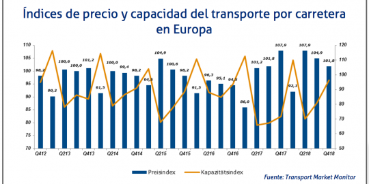 La 37ª Edición del ‘Transport Market Monitor‘, elaborado por TimConsult con la colaboración de Transporeon, muestra que los precios del transporte por carretera en Europa han descendido un 3% en el cuarto trimestre de 2018 con respecto a los registros del tercer cuarto de dicho ejercicio.